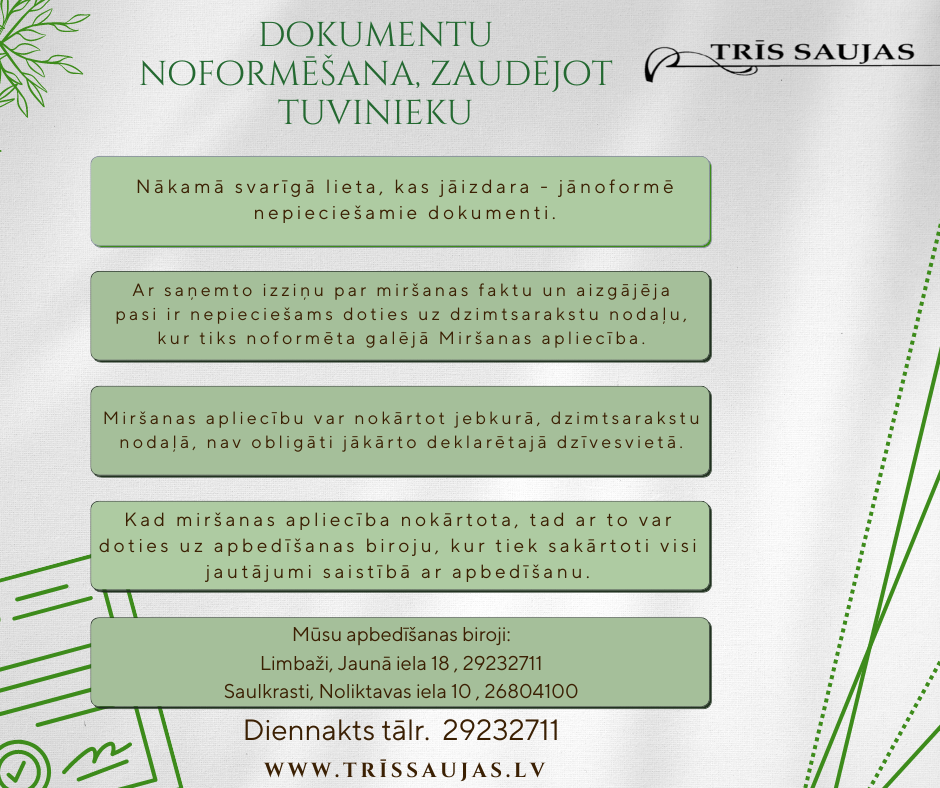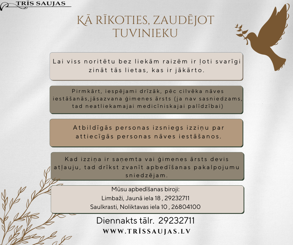 Dzīvē neizbēgami ir arī brīži, kad notiek pats sliktākais  – esam zaudējuši tuvu cilvēku, kurš devies mūžībā. Nav nekas neparasts, ka šādos brīžos jūtamies kā “melnajā caurumā”- zaudējuši pamatu zem kājām, izmisuši un apjukuši. Taču īsti sērot nav pat laika, jo visdrīzākajā laikā jāpaveic vēl kāds svarīgs uzdevums – ar cieņu jāpavada aizgājējs citā saulē jeb jāsarīko viņa bēres.