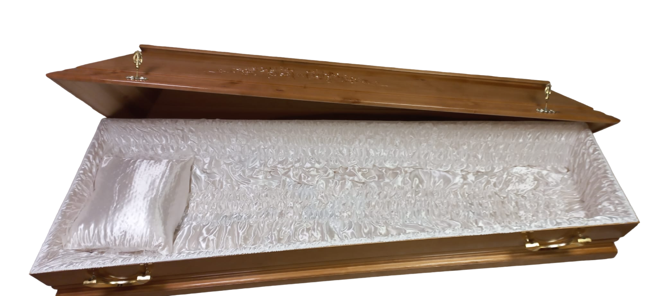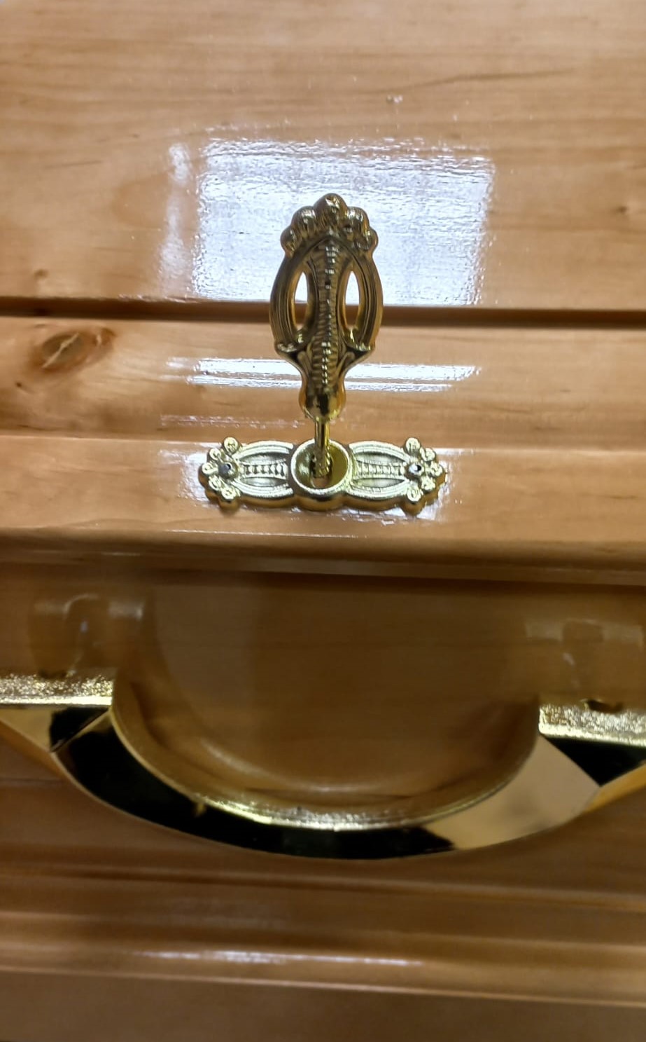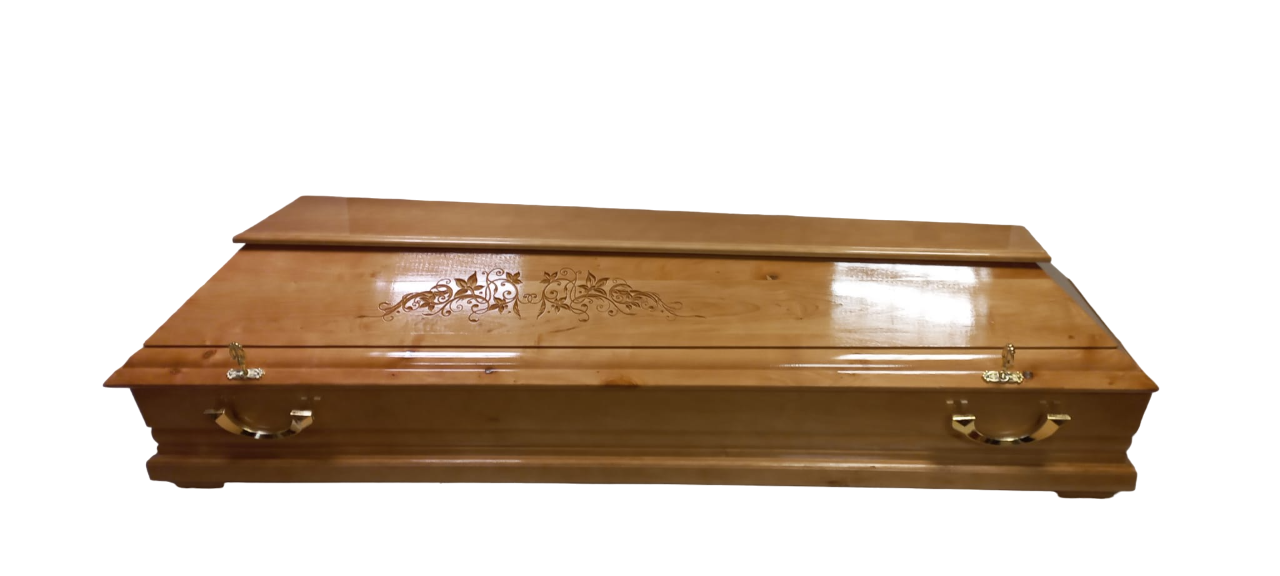 Apses koka zārks ar dekoratīvu elementu, rokturiem un dekoratīvām skrūvēm vāka nostiprināšanai.