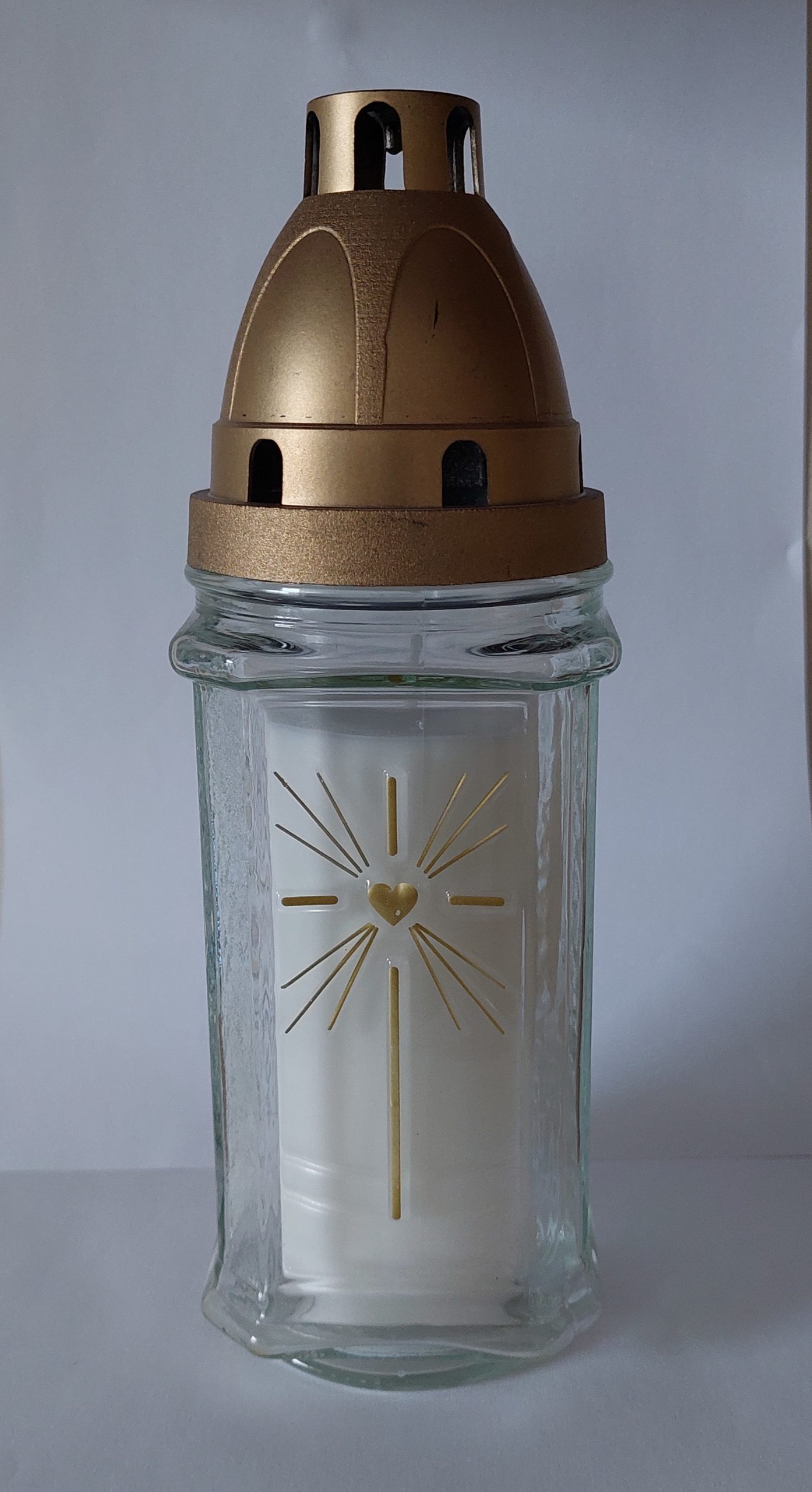 Scece ar stikla kupolu, plastmasas jumtiņu un krusta dekoru zelta krāsā. Degšanas ilgums līdz 2 diennaktīm. Degošā sveces daļa maināma.